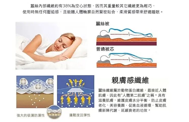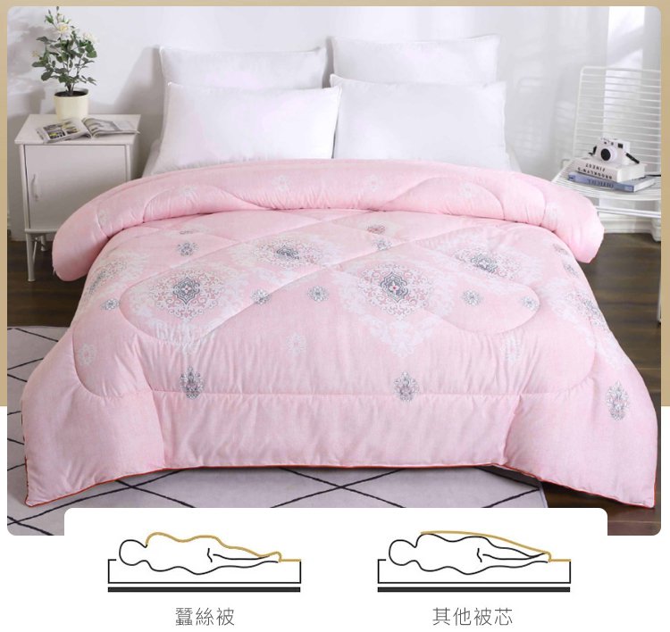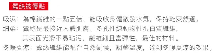 蠶絲被的特性就是柔軟透氣,親膚不過敏,抑菌防螨。然後它的溫度是可以是可以隨著我們的氣候做調節的,我們的人體大概需要什麼樣的溫度的話,它就會幫你調節到什麼溫度~對人體保健具有極佳的效果!